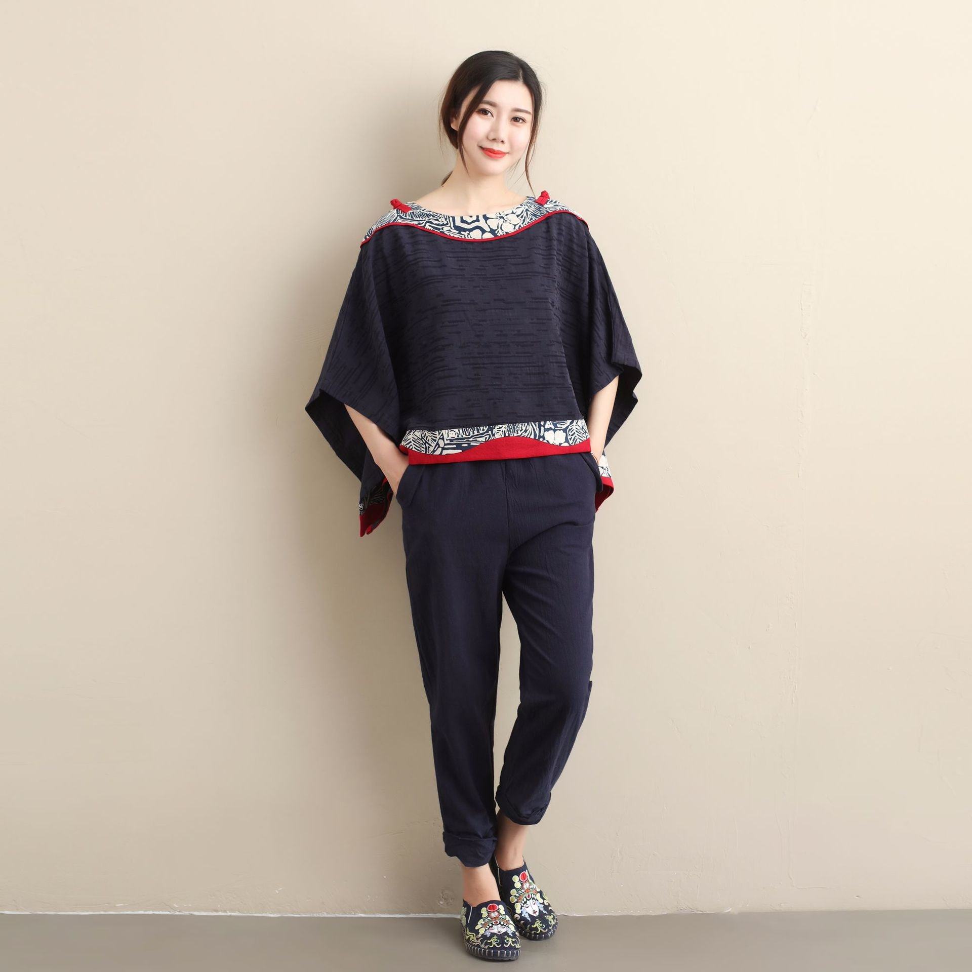 夏季新品 燕尾衫竹节棉麻短袖T恤拼花设计中国文艺风圆领宽松款热门设计联盟服务商